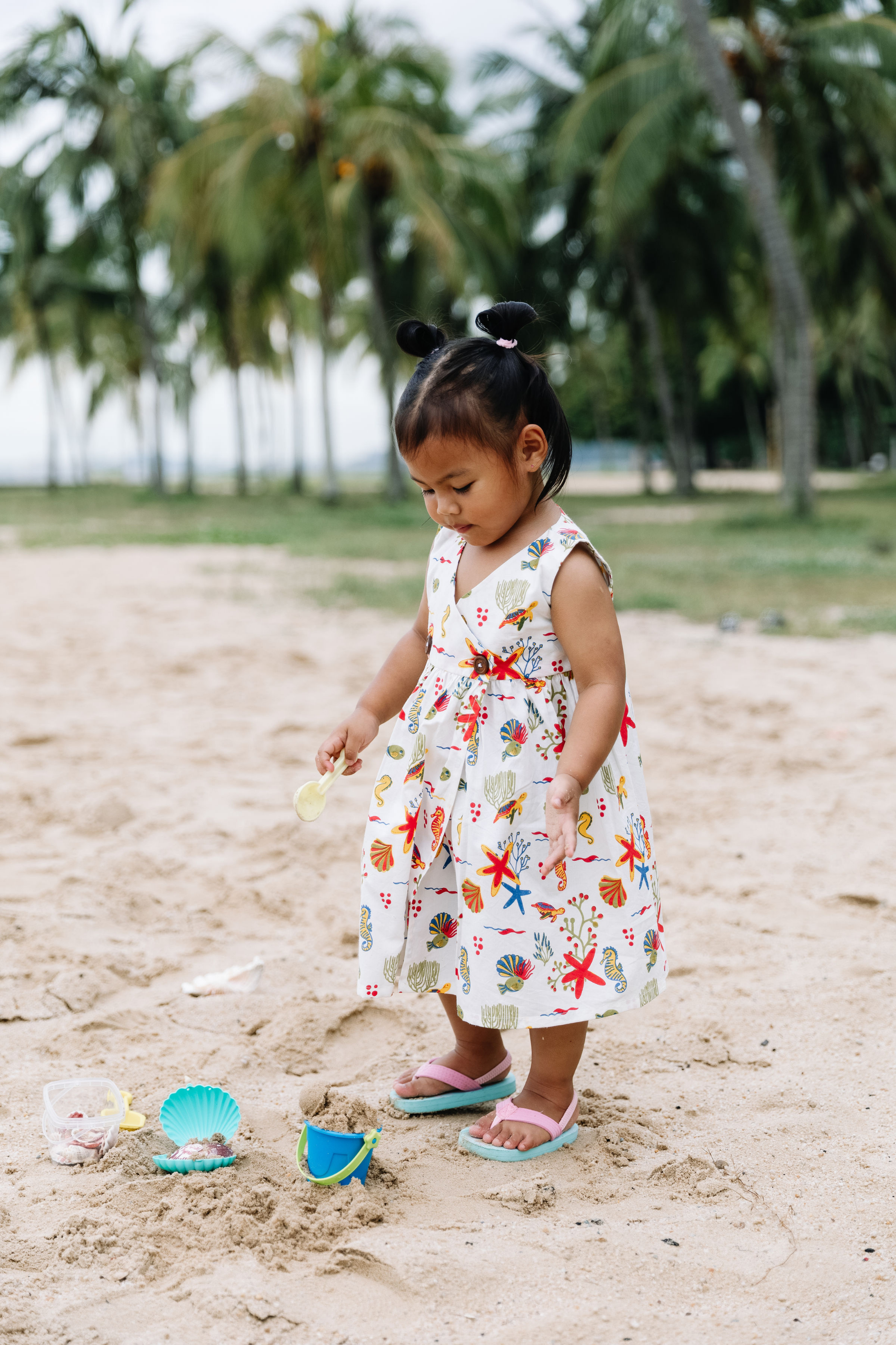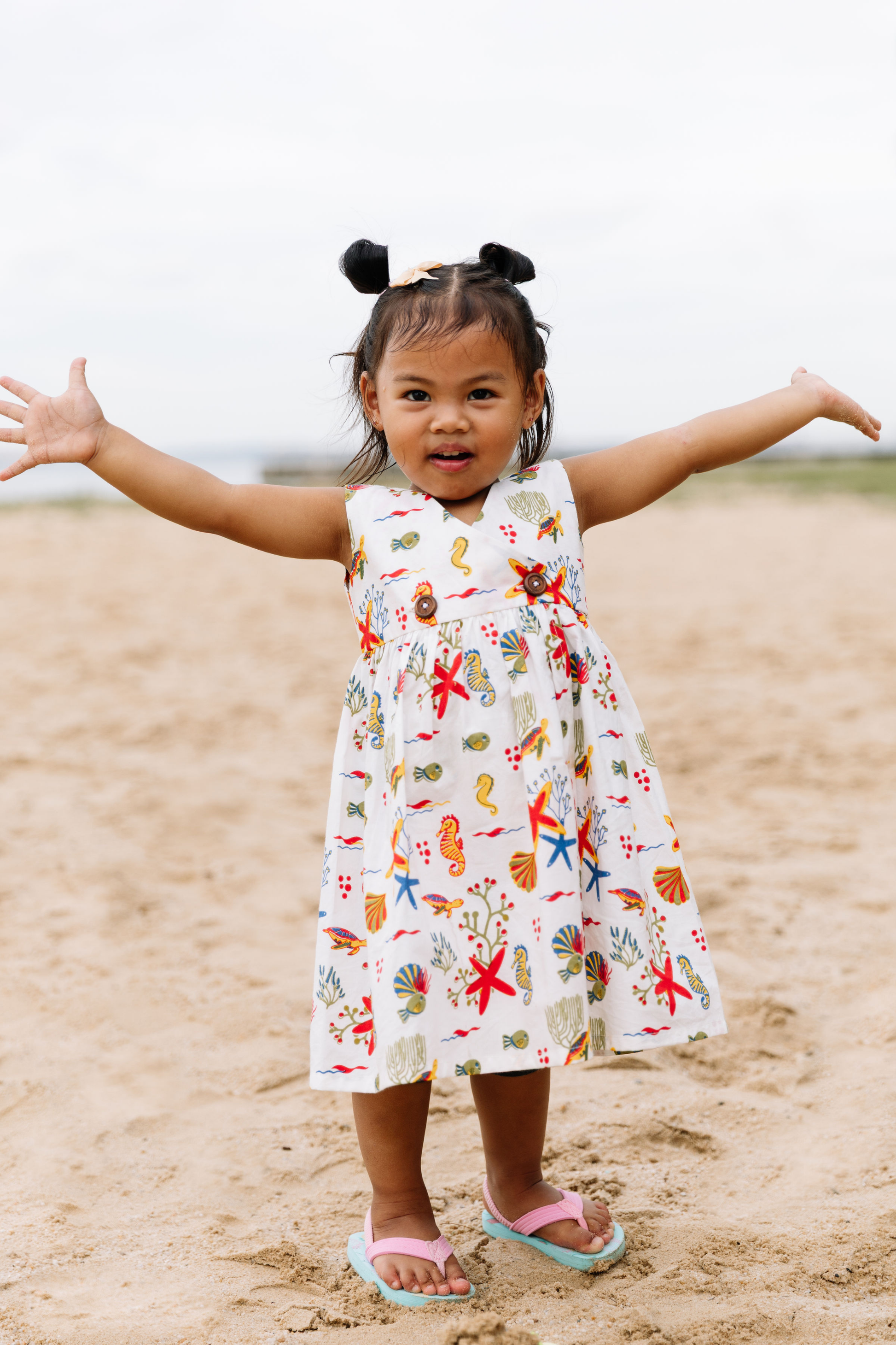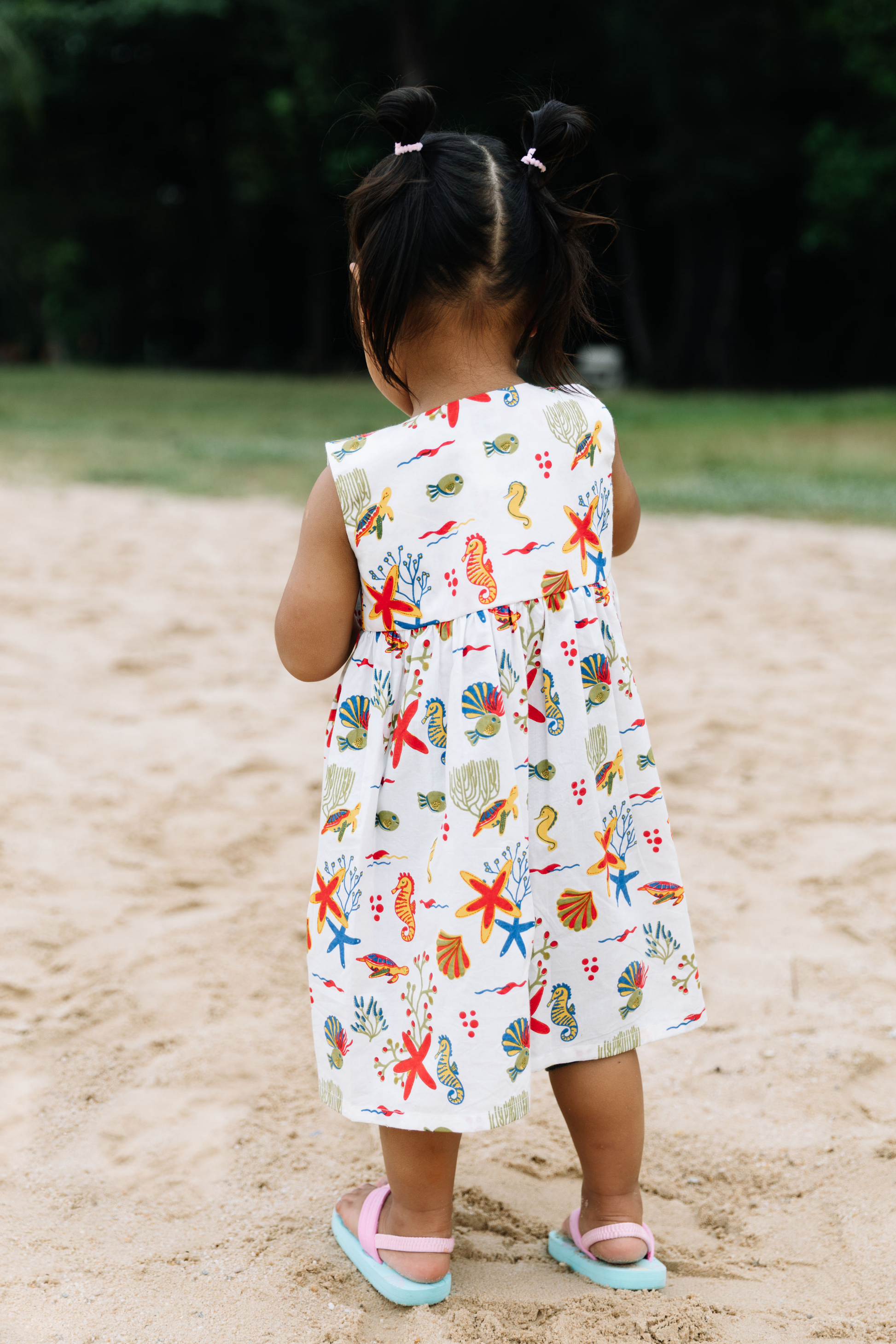 Fitted a-line, v-neck, sleeveless dress that buttons in the front, crafted in organic cotton poplin fabric, screen printed with our signature ocean life inspired motif using azo-free dyes.