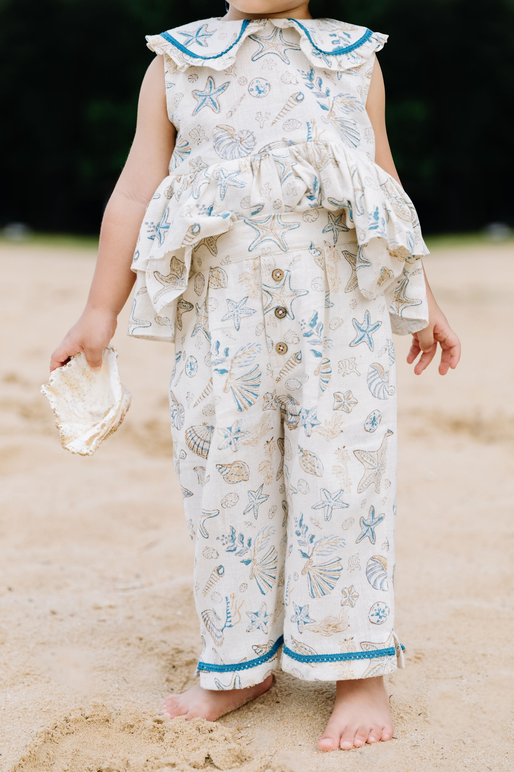 Fitted straight-leg trousers with elastic waist, crafted in handspun and handwoven organic cotton fabric, hand block printed with our signature ocean life inspired motif using azo-free dyes.