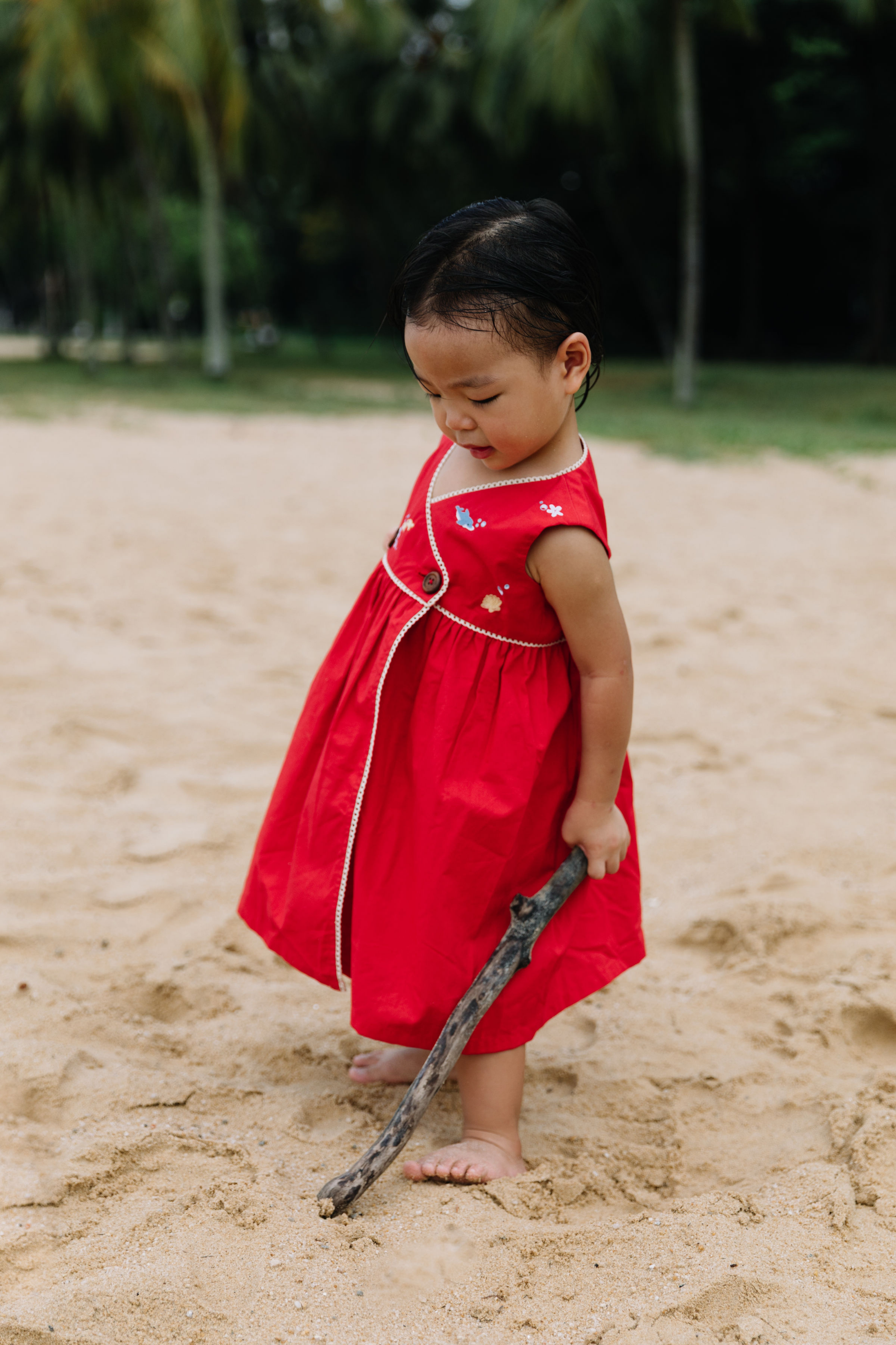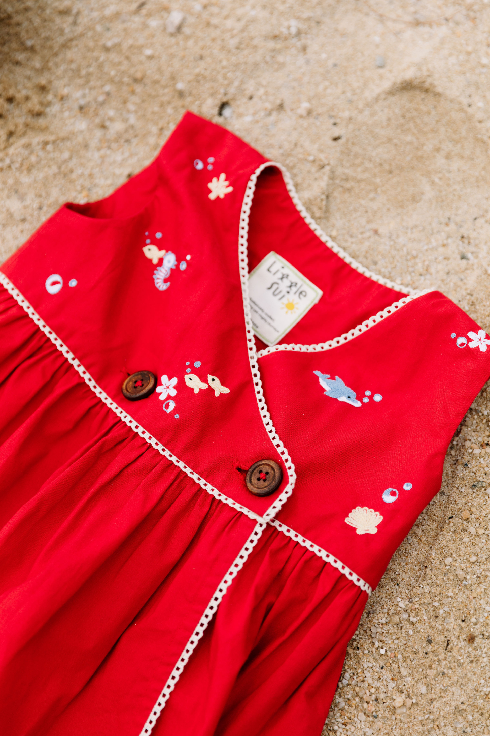 Fitted a-line, v-neck, sleeveless dress that buttons in the front, crafted in azo-free dyed organic cotton poplin fabric, hand embroidered with ocean life motifs.