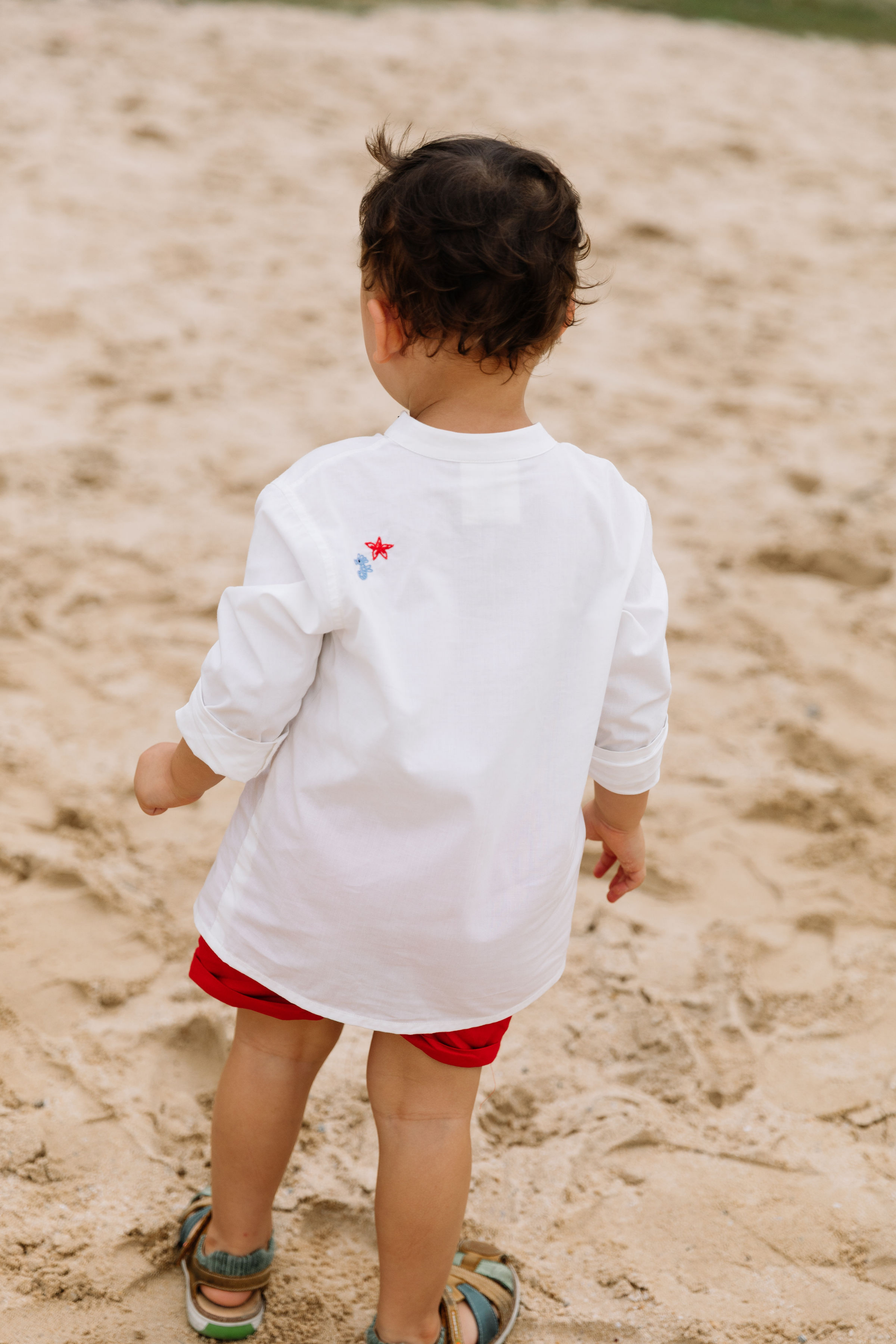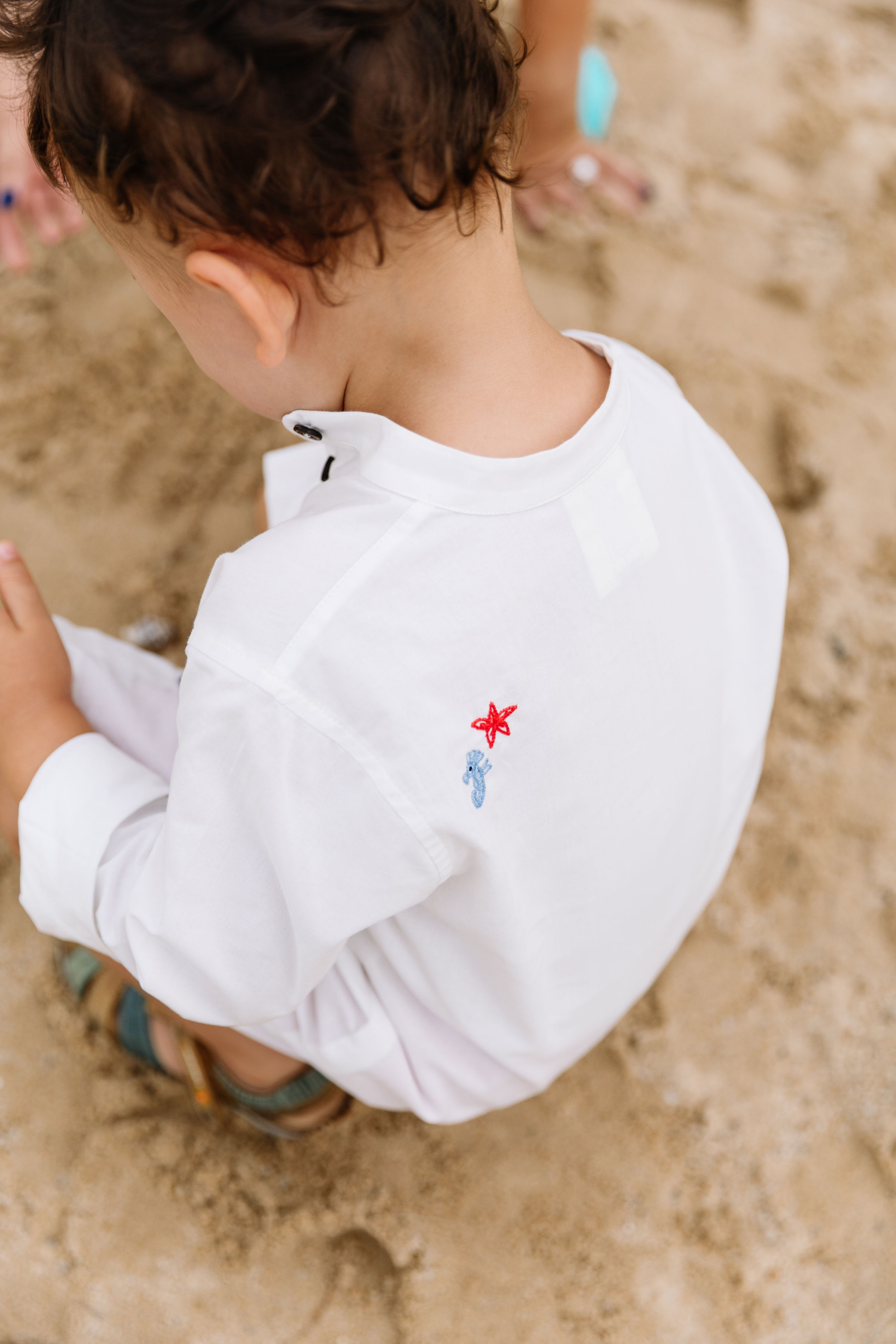Relaxed fit, round neck, classic shirt that buttons in the front, crafted in organic cotton poplin fabric, hand embroidered with a ocean life inspired motifs.
