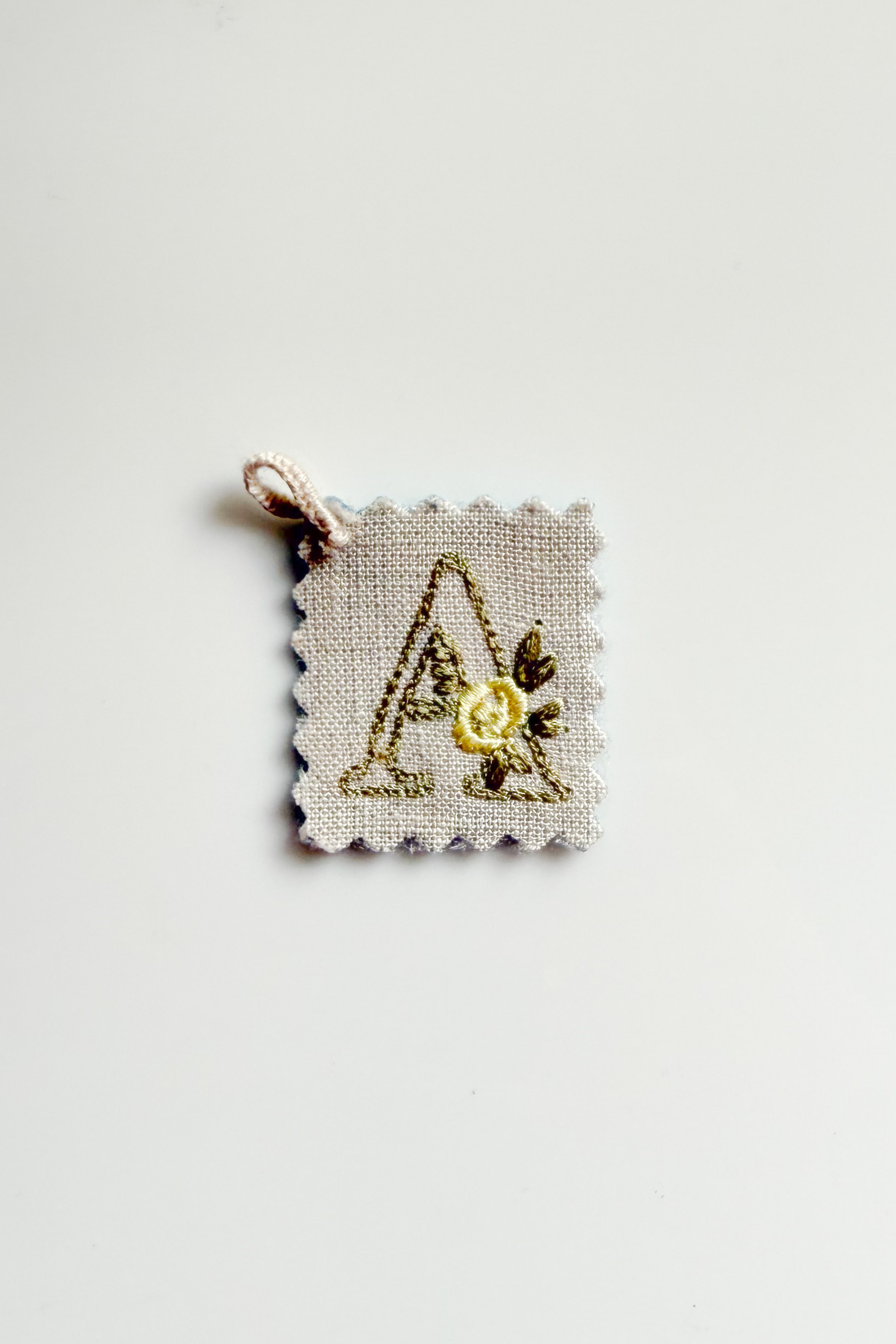 This upcycled keyring charm is crafted in linen, that's machine embroidered with a letter motif and nature-inspired motifs.