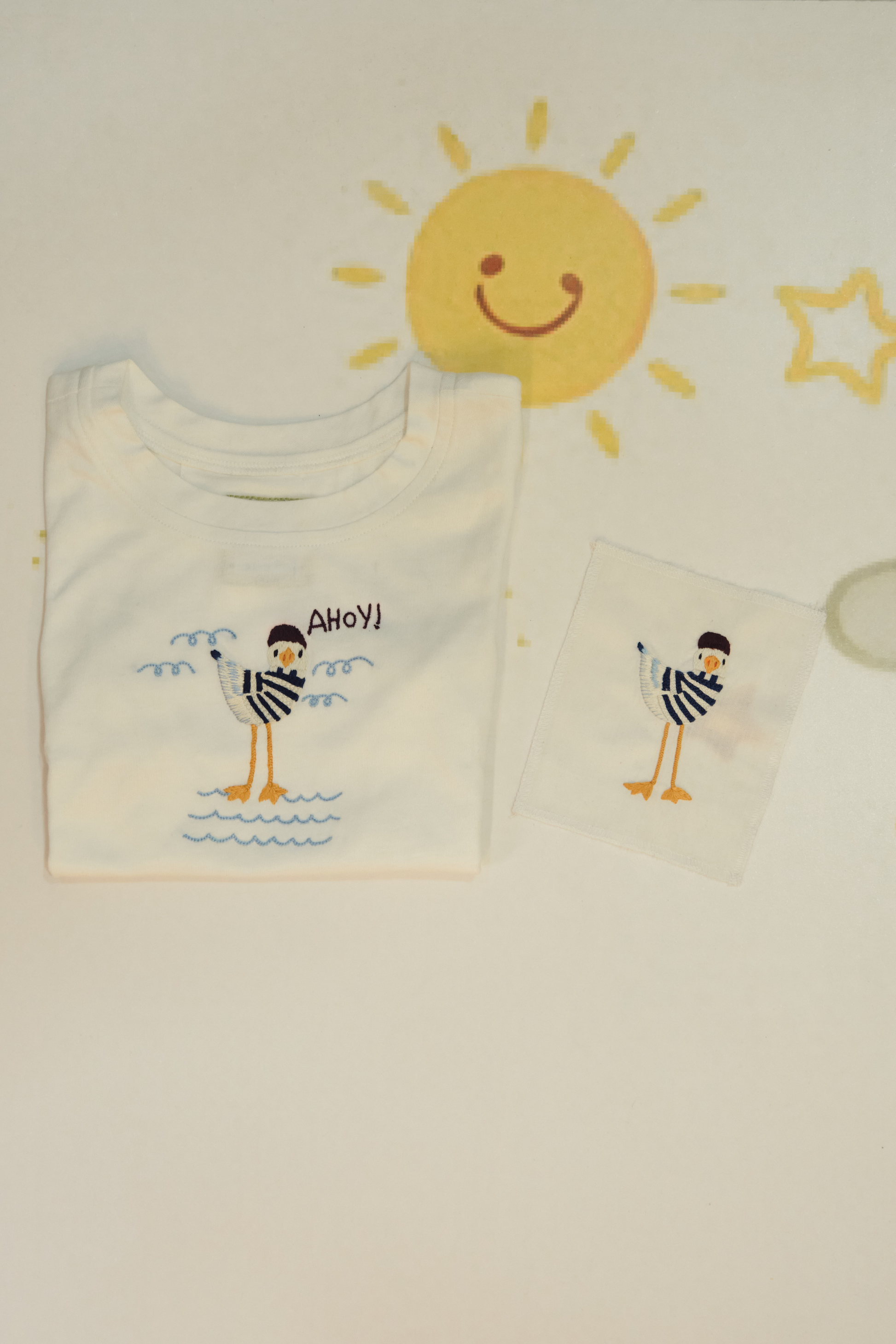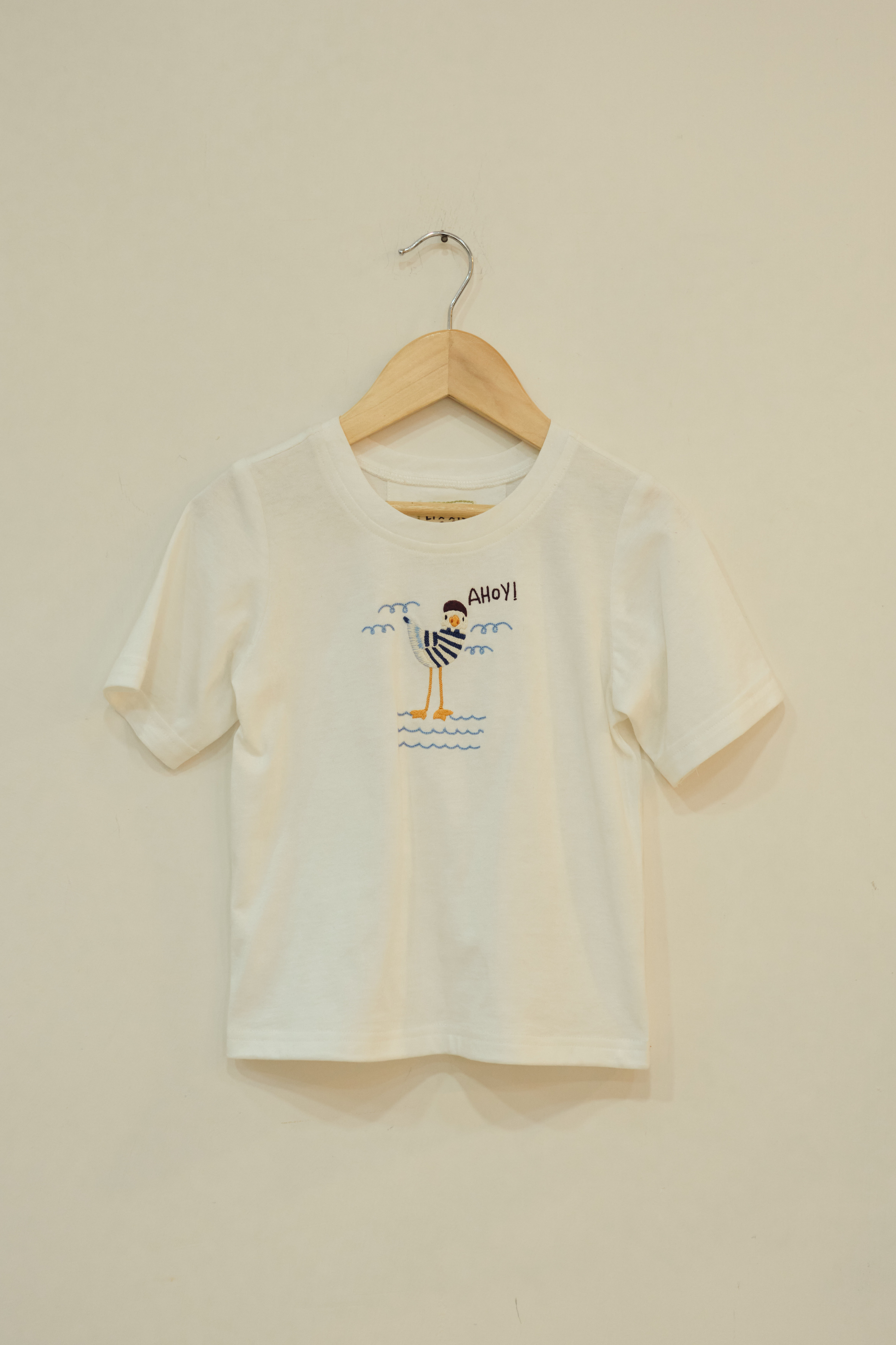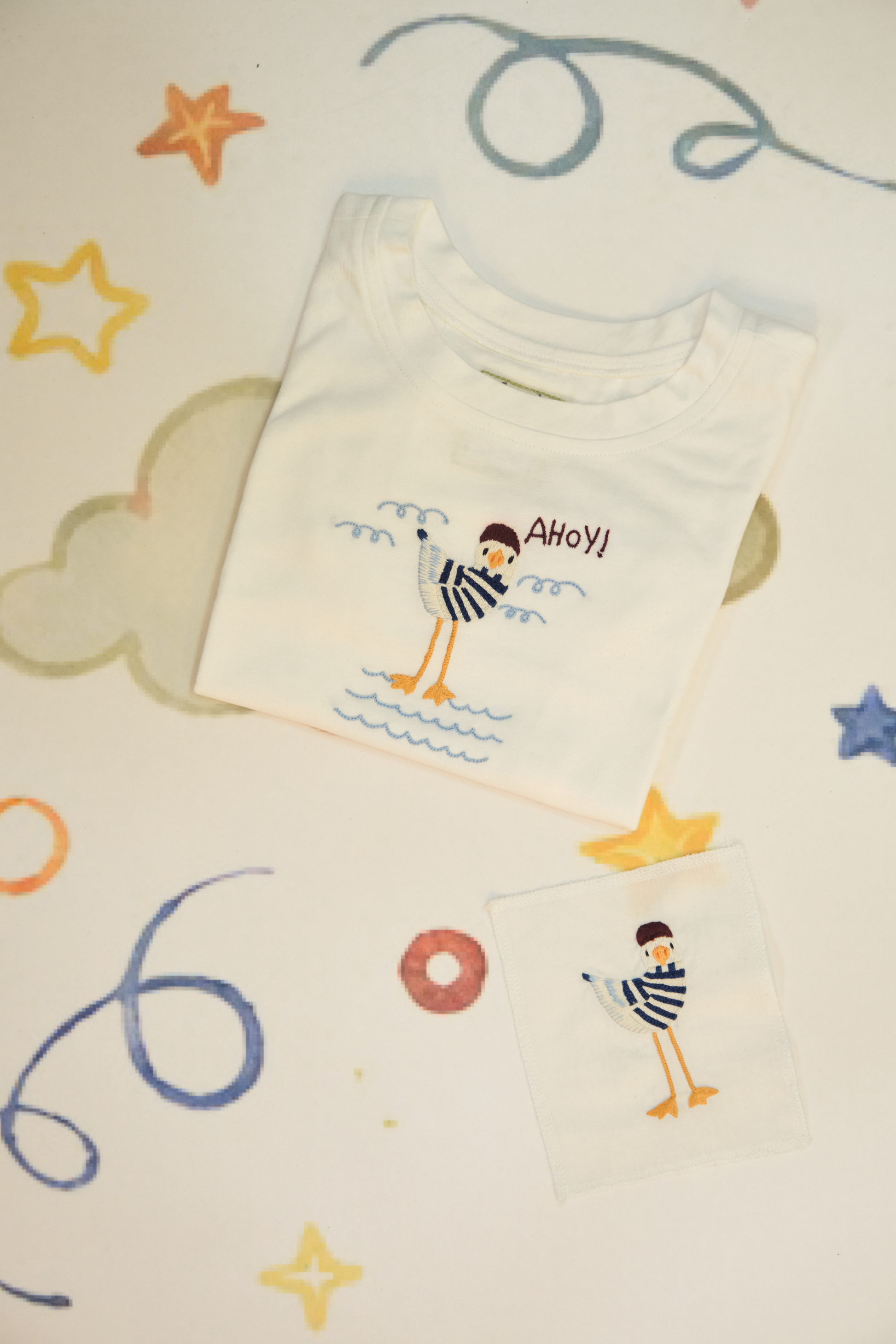 Regular fit, round neck, short sleeve t-shirt crafted in organic cotton fabric, hand embroidered with a seagull and text motifs. Sweet and stylish, this cheery shirt is an absolute everyday essential - easily matched with anything in your closet, a classic style that will stand the test of time.