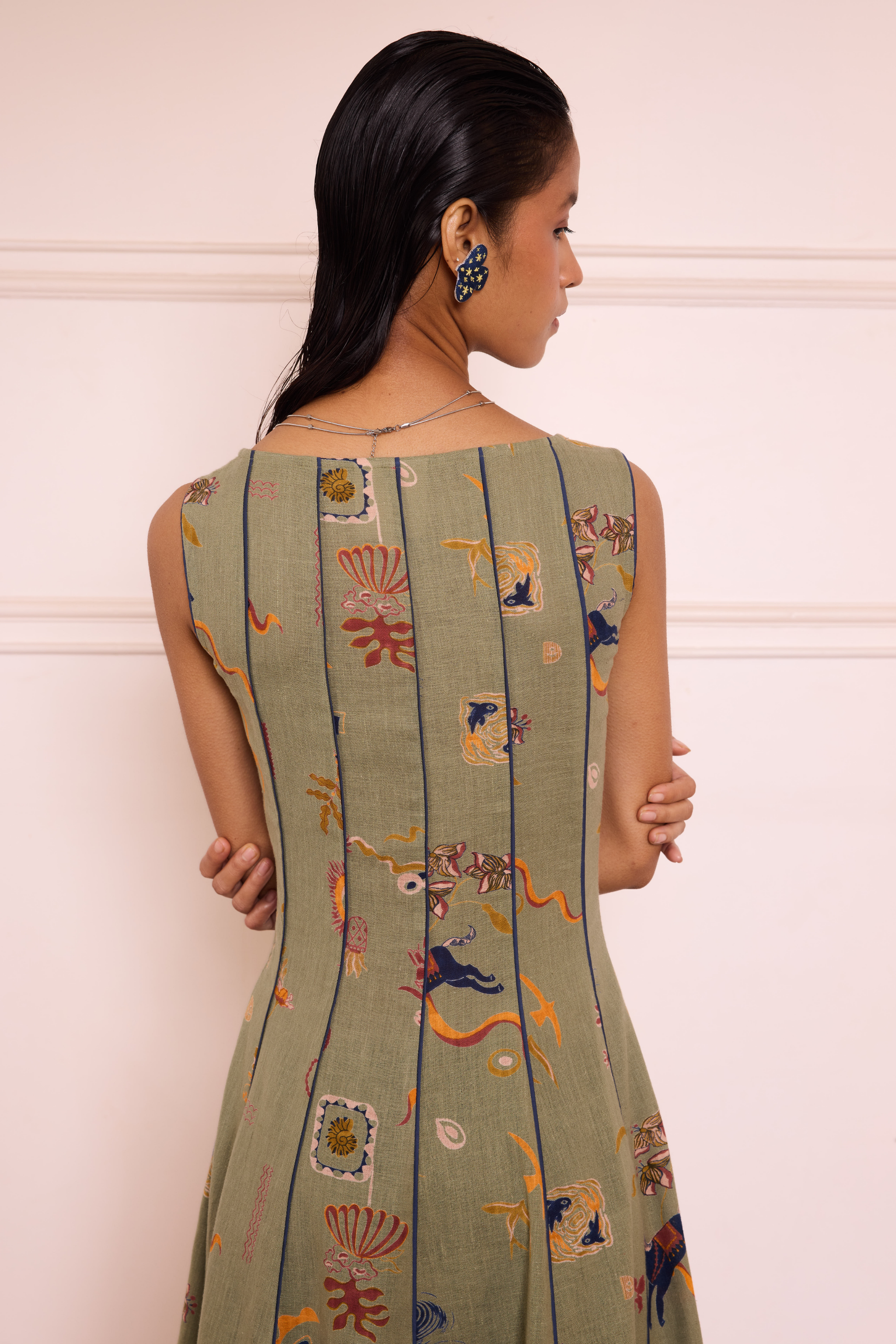 Fitted, strappy, round neck, a-line maxi dress crafted in handspun and handwoven organic cotton fabric, discharge screen printed with our signature nature-inspired motif using azo-free dyes.