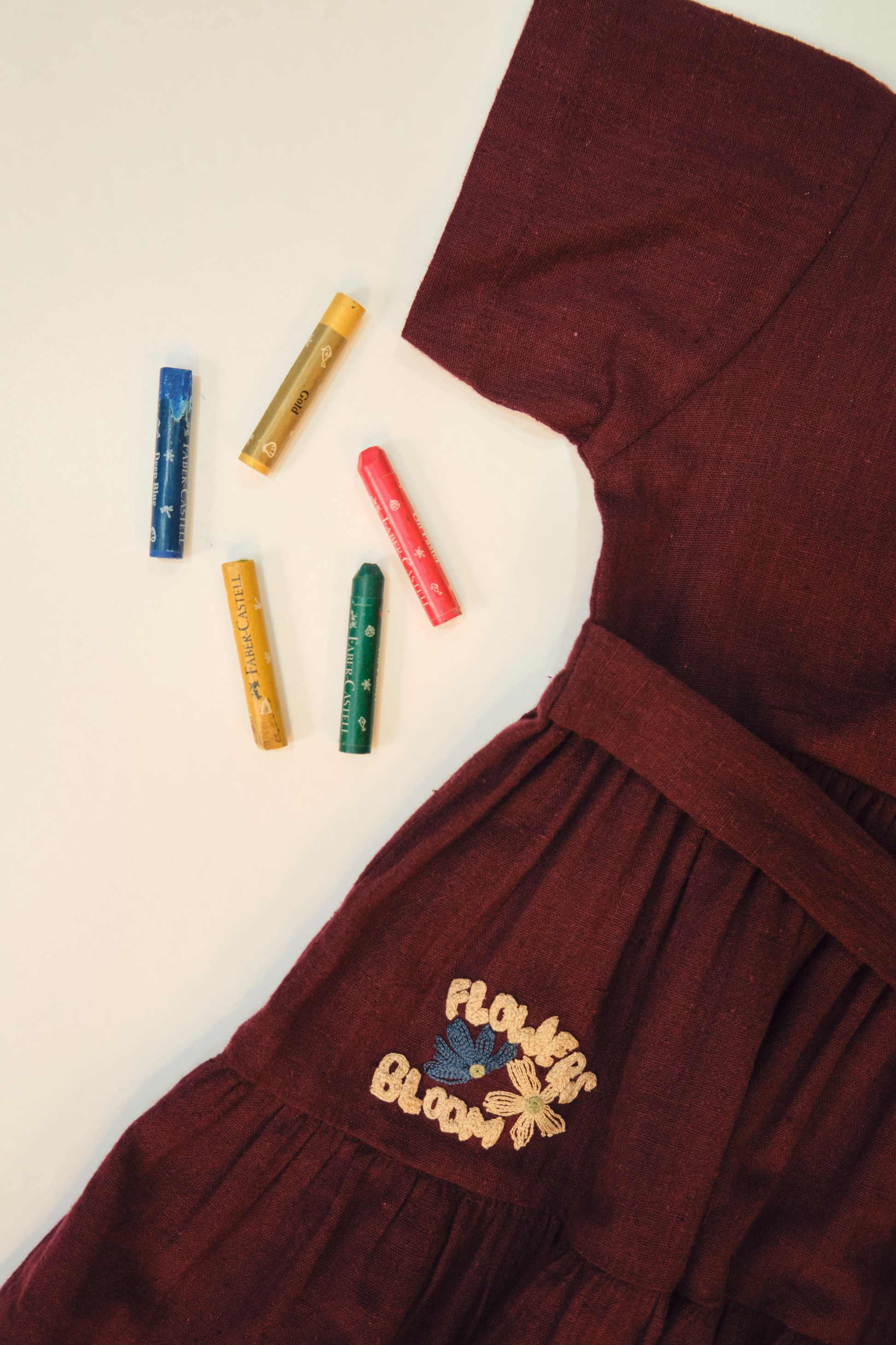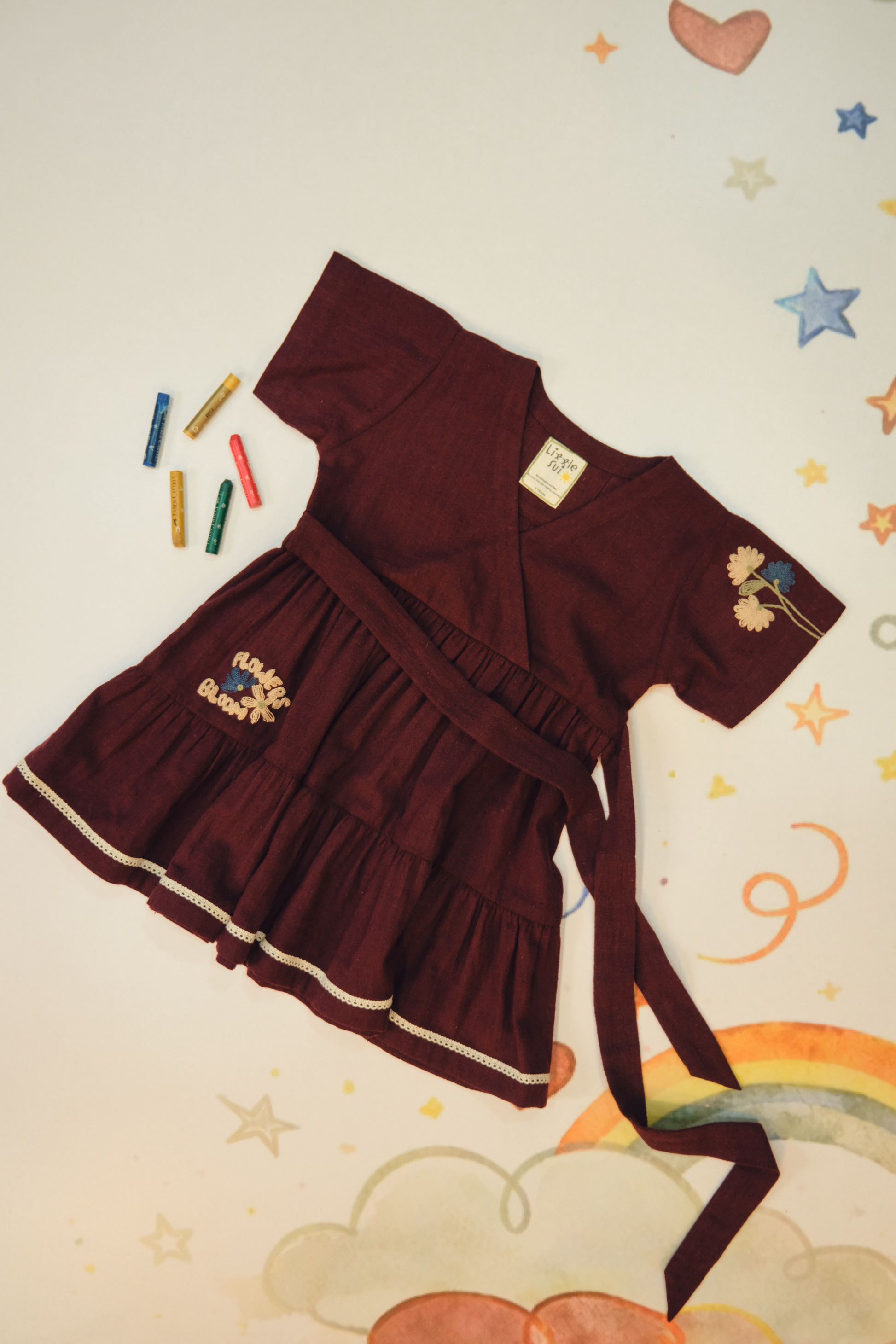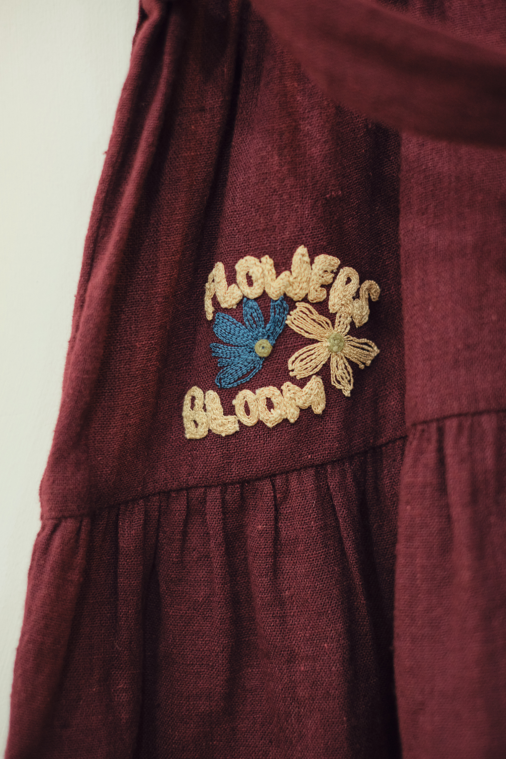 Relaxed fit, a-line, half-sleeve, v-neck dress with tie at the waist, crafted in azo-free dyed, handspun and handwoven organic cotton fabric, machine embroidered with flower and quote motifs. This is a bestselling silhouette now made for our littles! This staple everyday dress is a must for any conscious closet, made for days out playing or staying in relaxing.