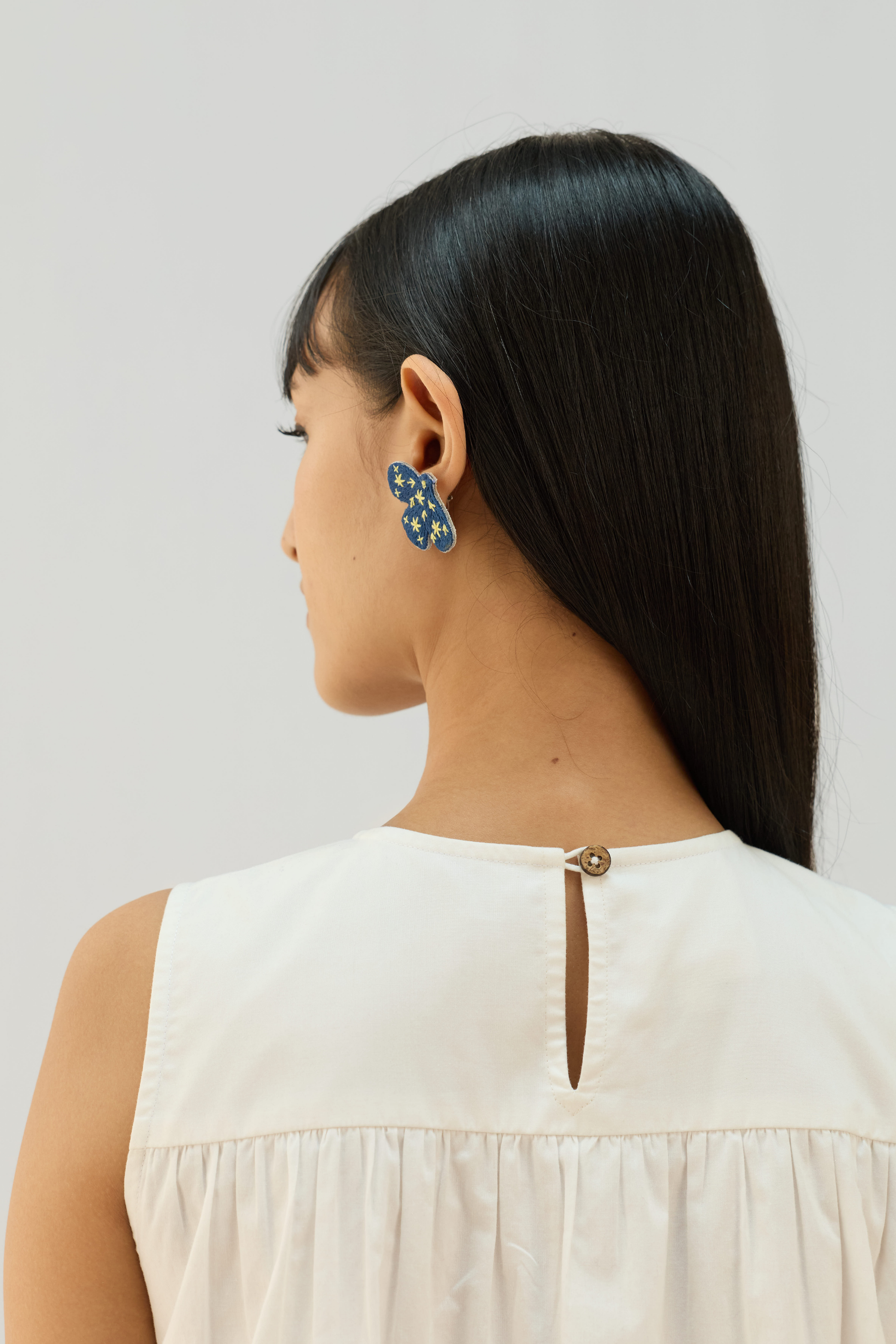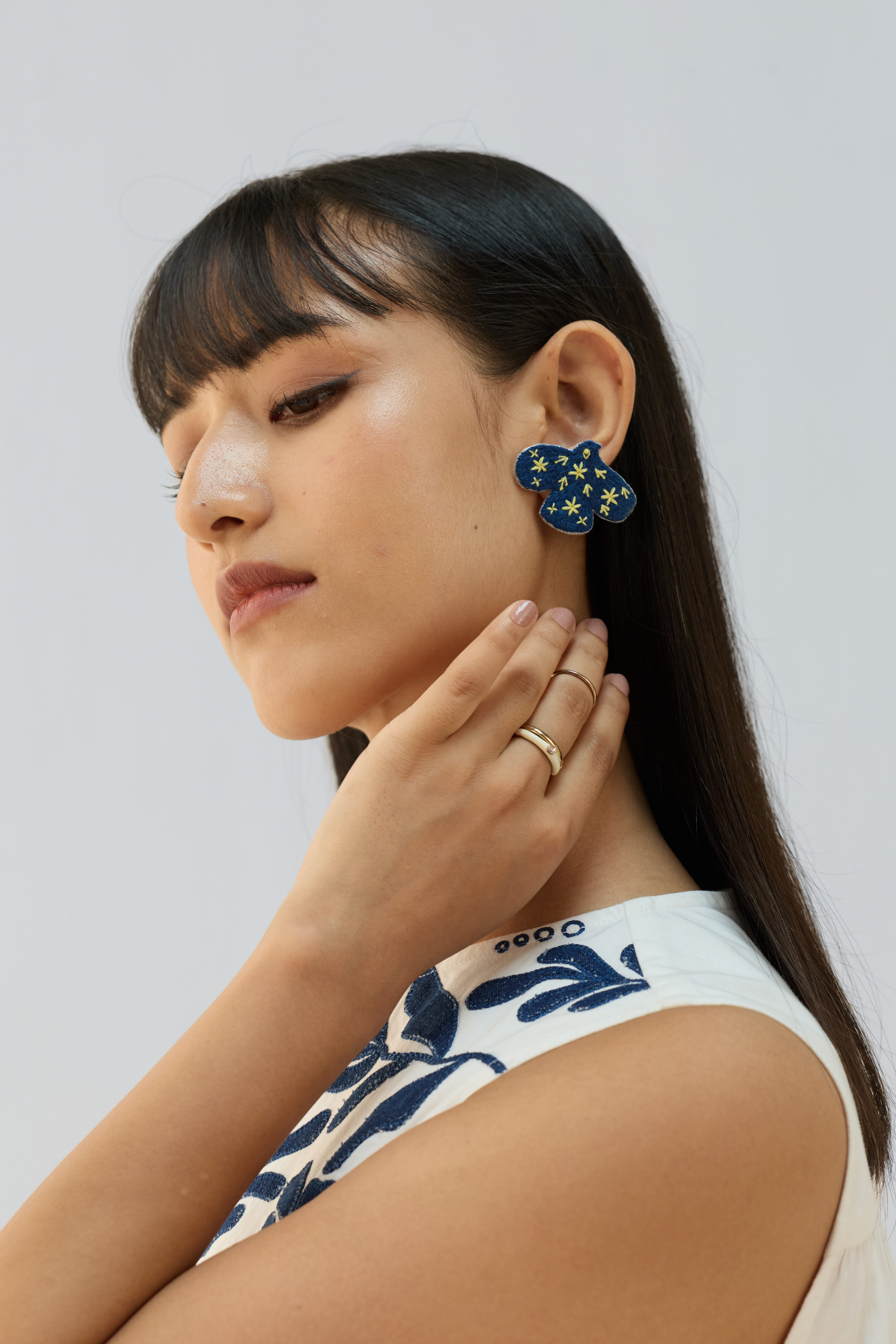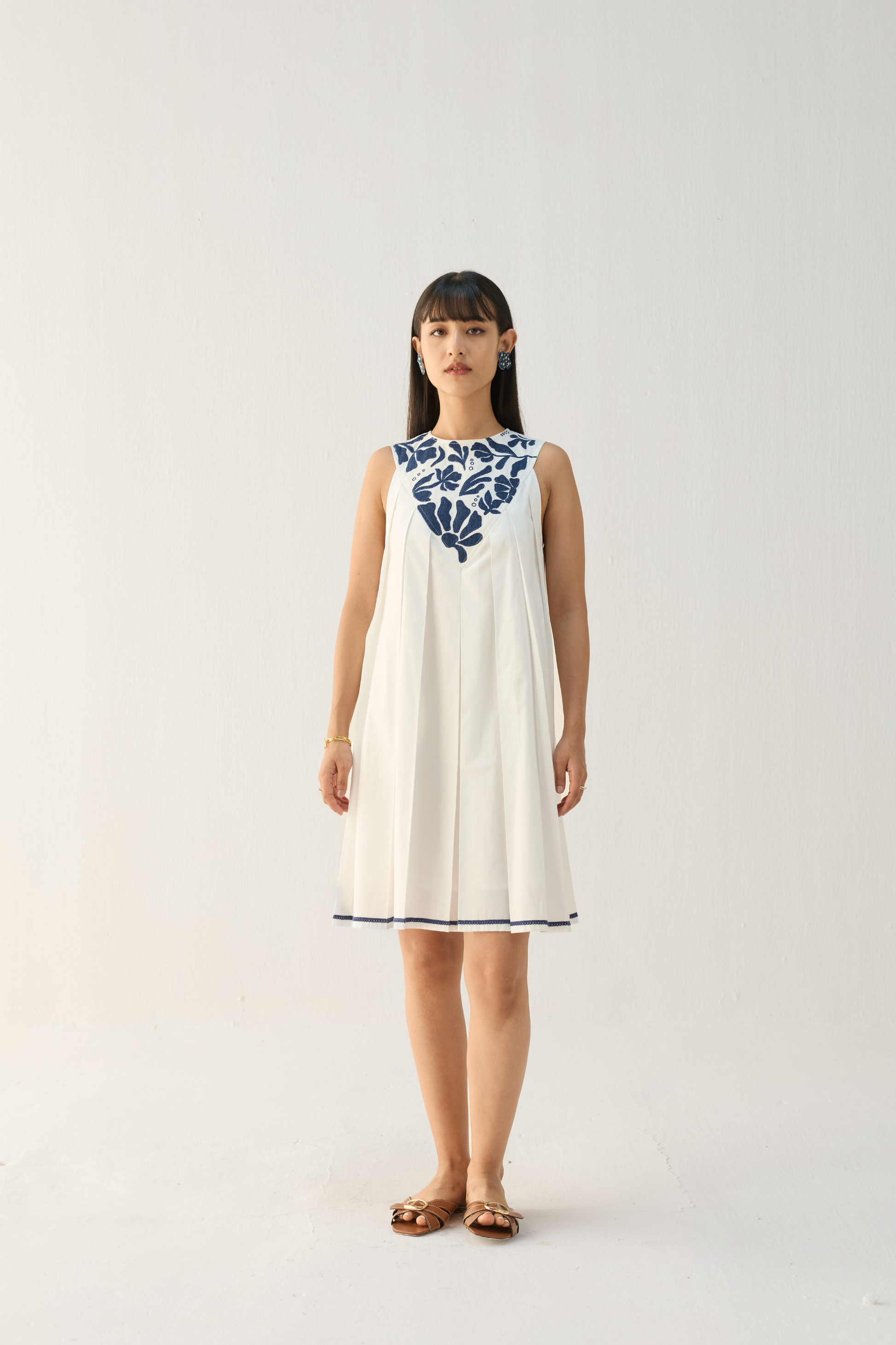Relaxed fit, sleeveless a-line dress crafted in organic cotton poplin fabric, hand embroidered with flower motifs made with sustainable denim.