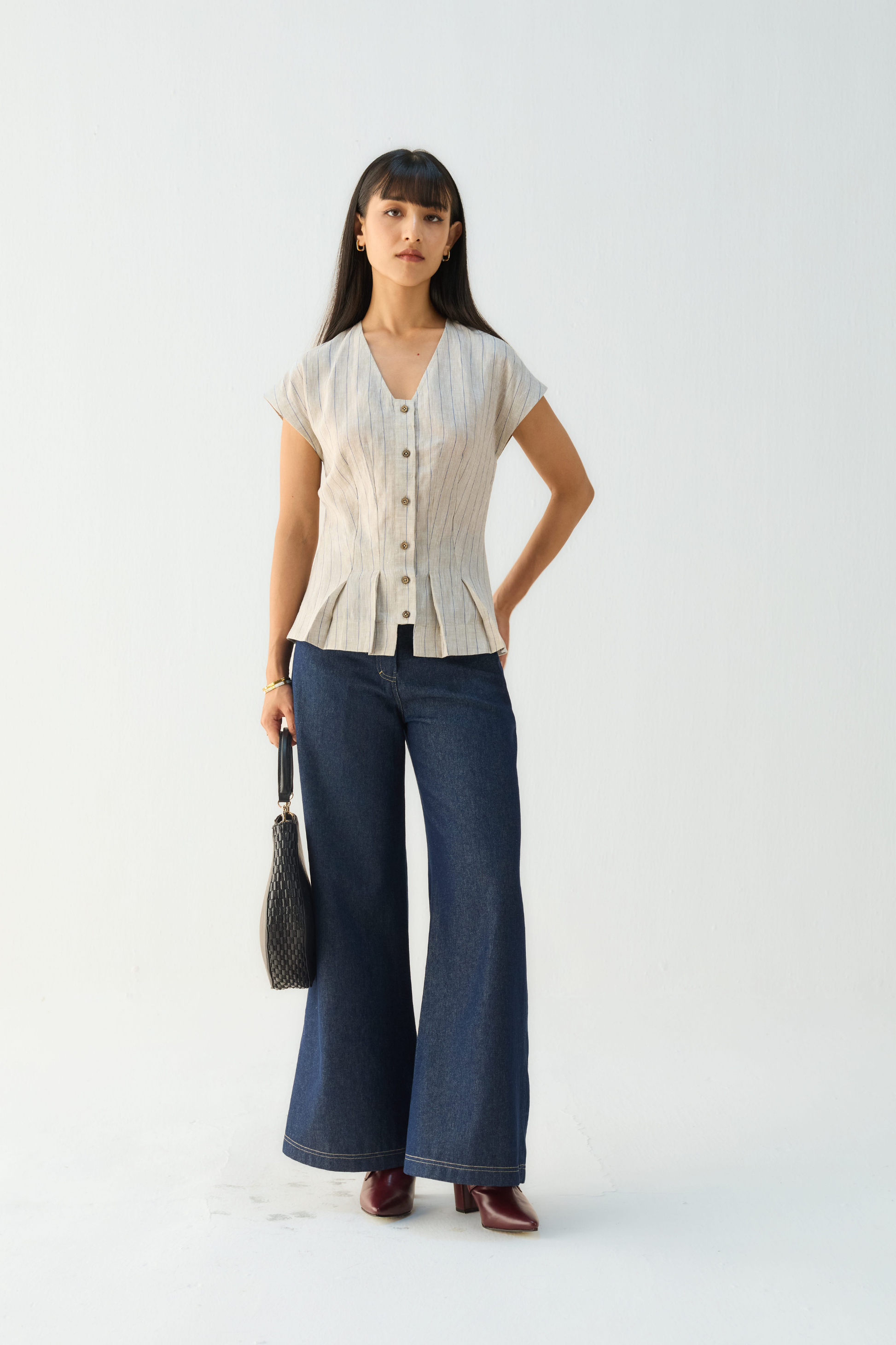 Fitted, v-neck, short sleeve, top that buttons at the front, crafted in striped 100% linen fabric.