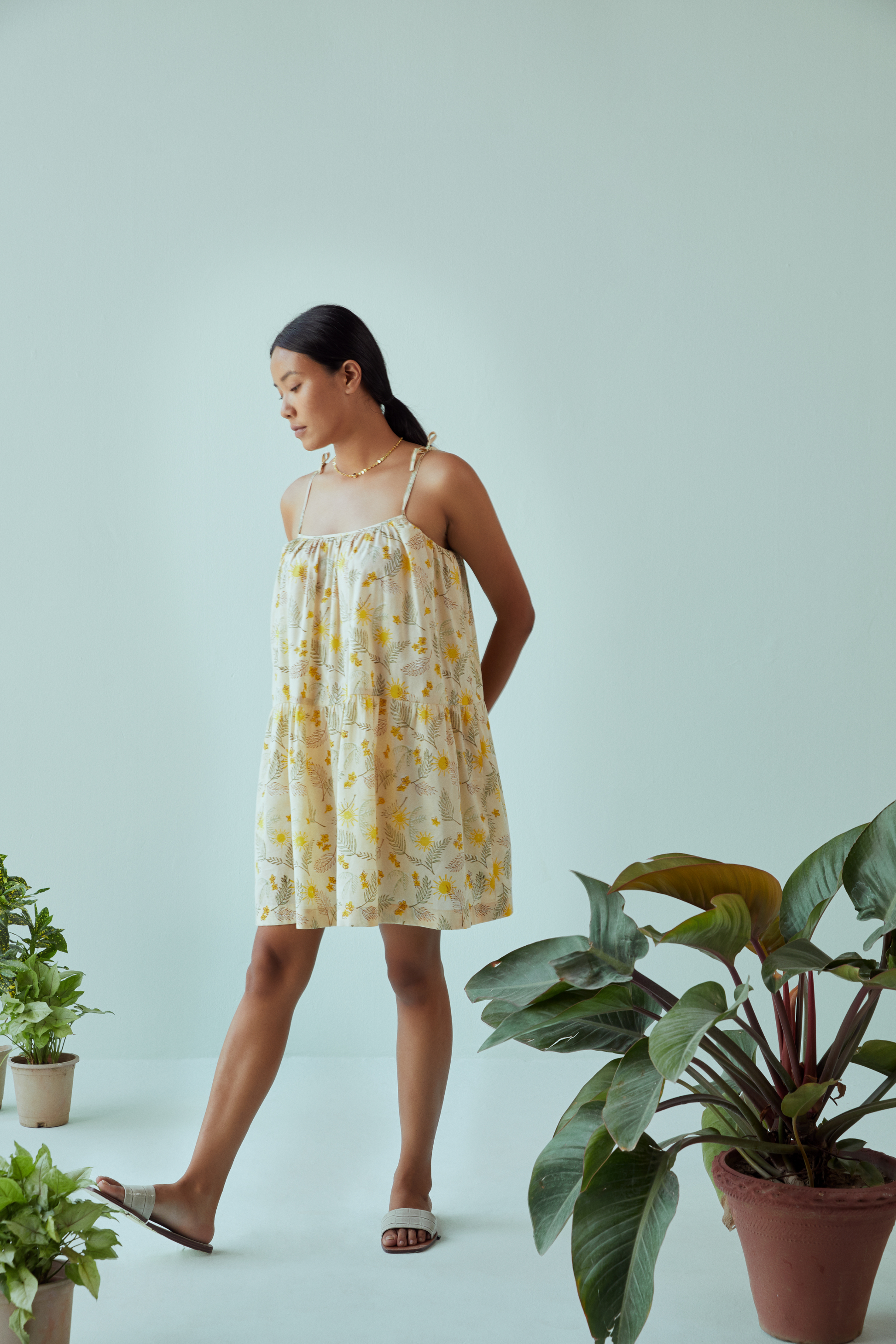 A summer staple, a breezy, flowy dress! This piece is crafted in Lyocell (a fabric created from wood cellulose fibres) and features our sunny palm print which shows off the cream and yellow hues of the champa flower, also known as plumeria or frangipani - that are recognised fondly by most in India for its humble beauty and sweet fragrance. It's flowey silhouette is one of our favourites to lounge in on a hot, summer's day.