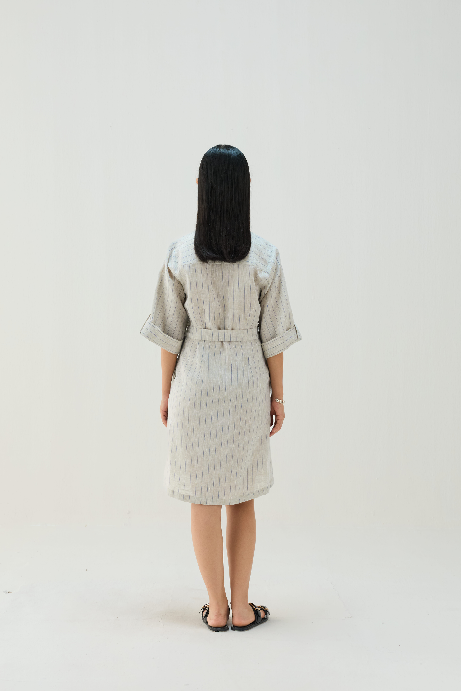 Regular fit, half sleeve, collared, midi shirt dress that buttons in the front and has a fabric tie at the waist, crafted in striped 100% linen fabric.