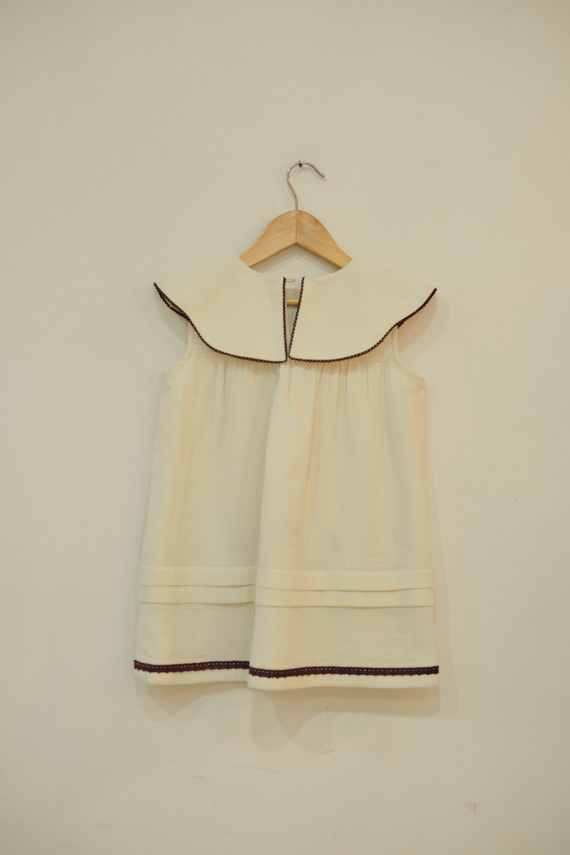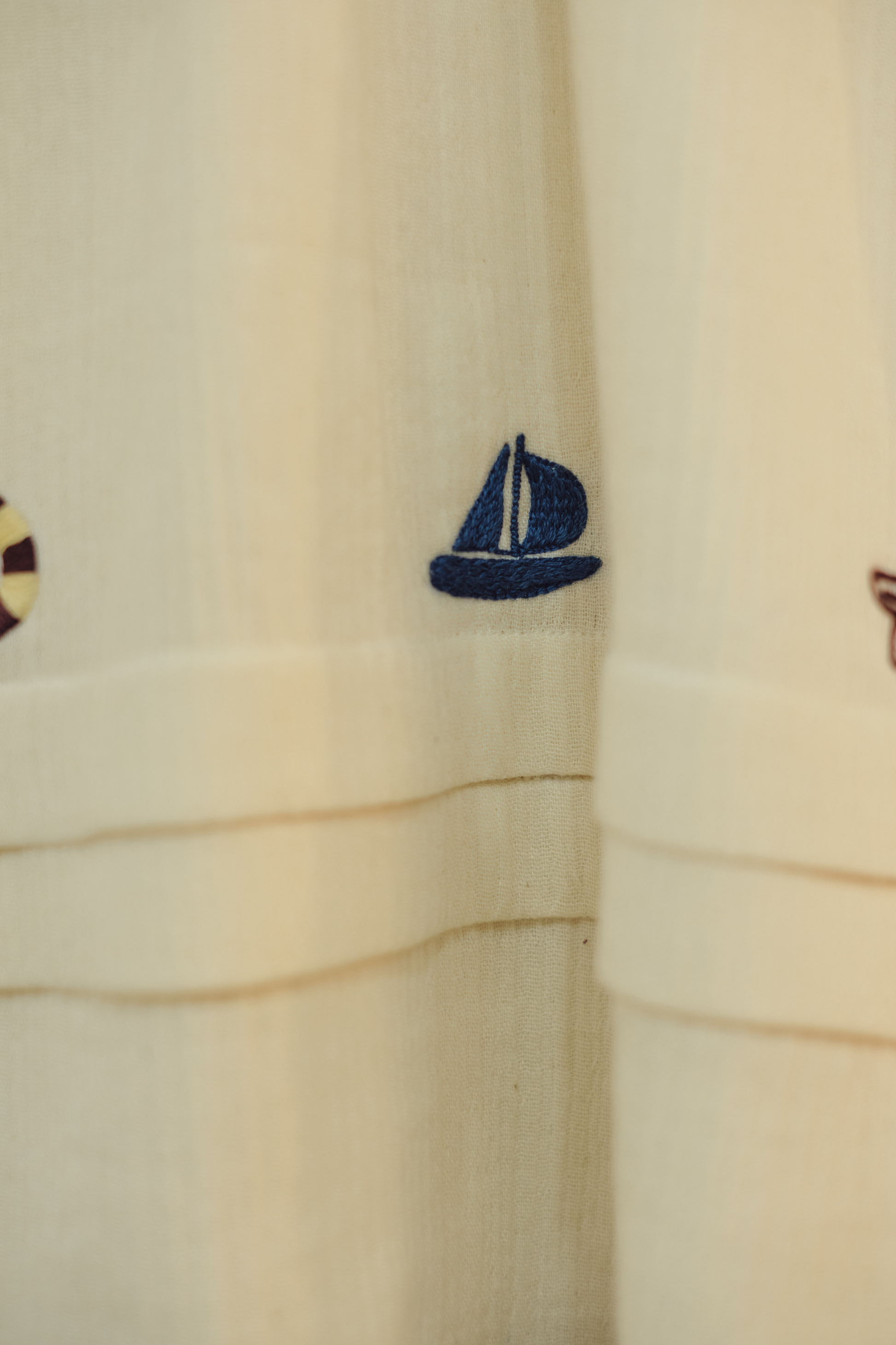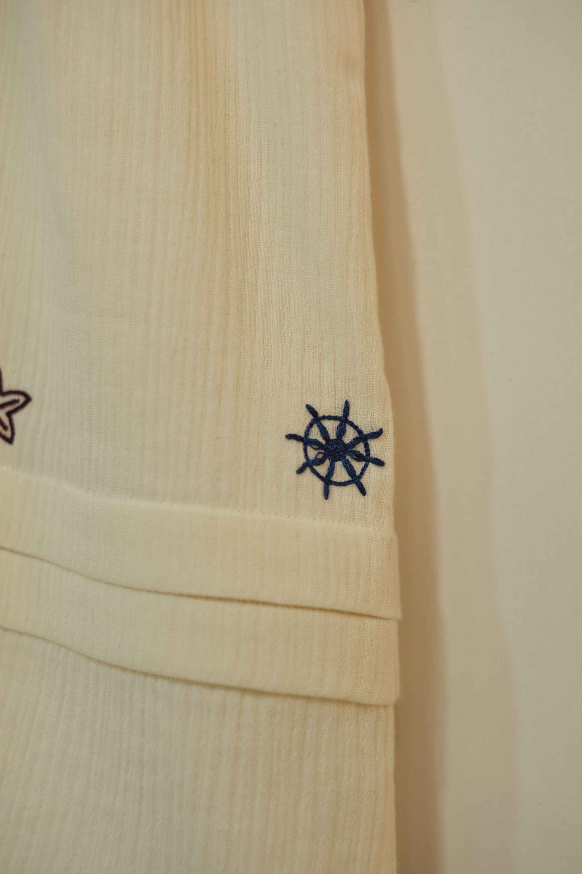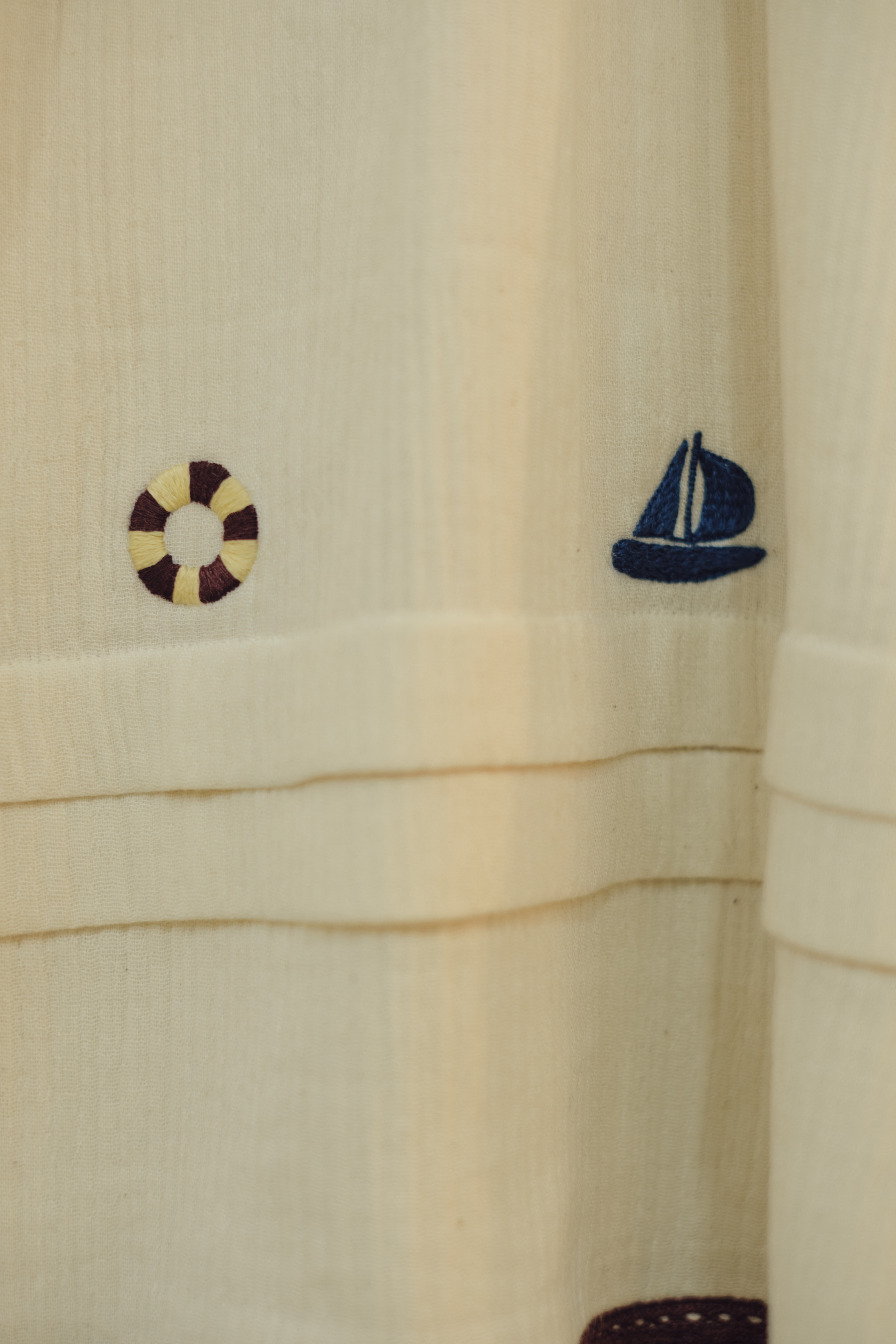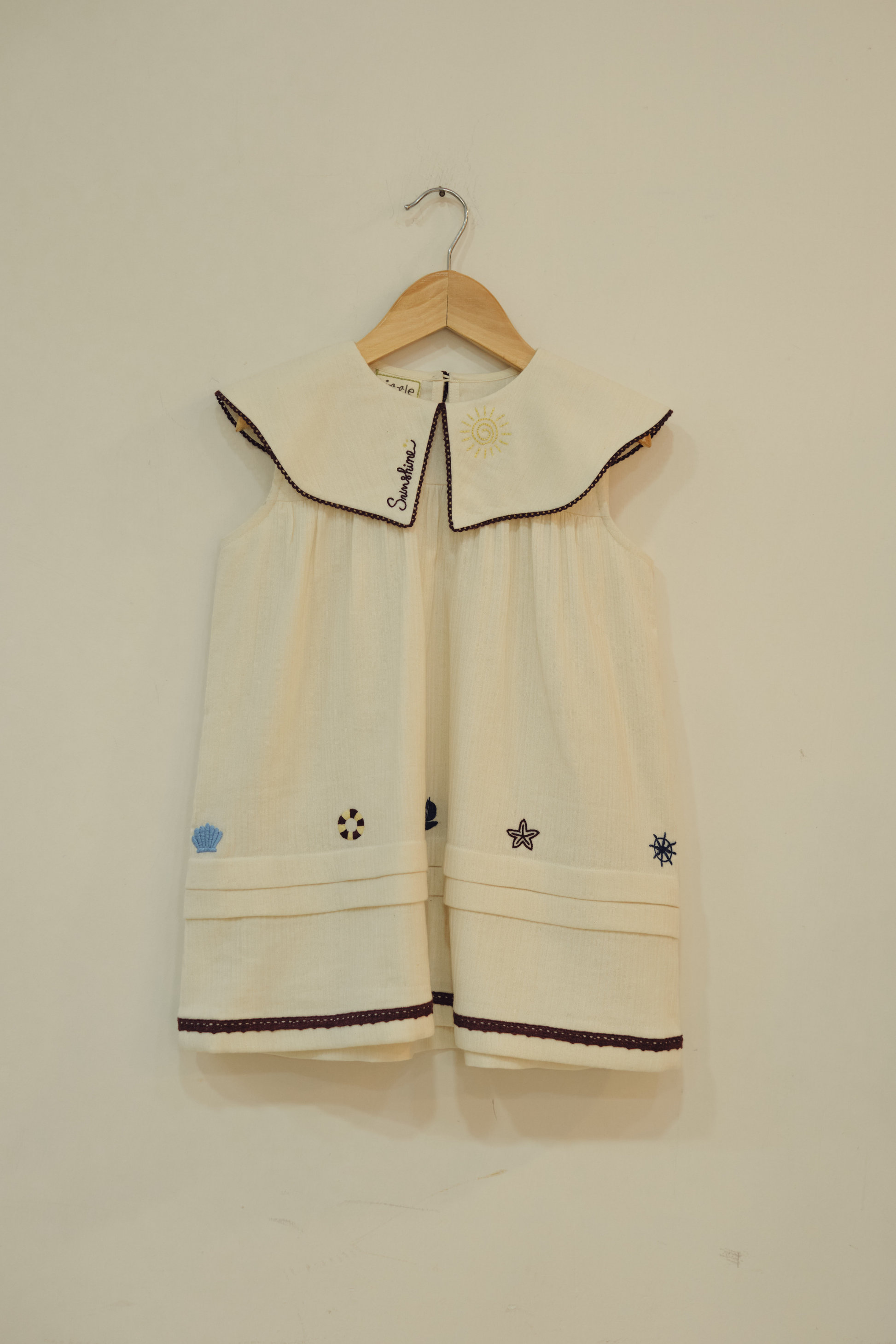Relaxed fit, a-line, round neck, sleeveless dress crafted in organic cotton double gauze fabric, hand embroidered with shore and text motifs. Sweet and stylish, this cheery outfit is an easy go-to for those days where you might need to pick something out quick but still feel comfy while moving around in easily, and look great.