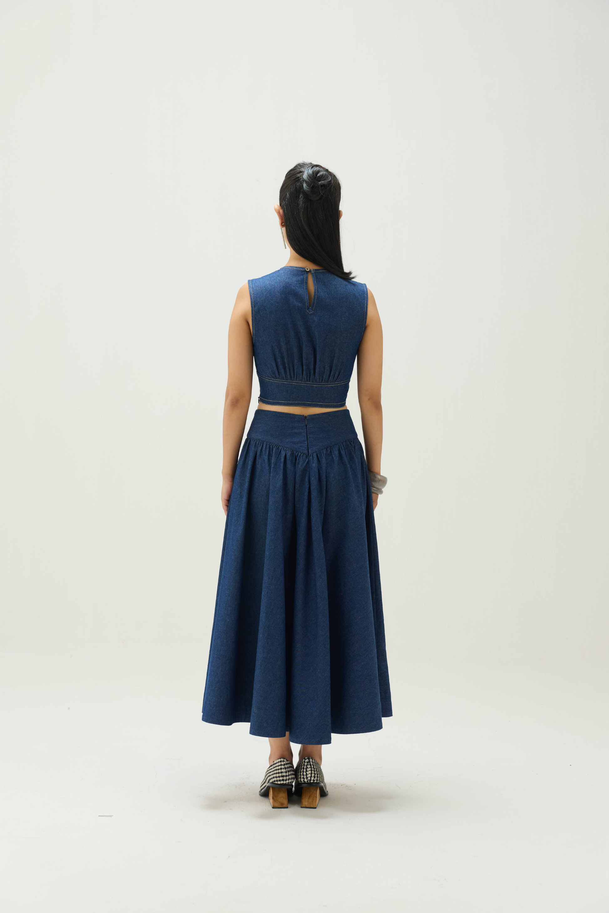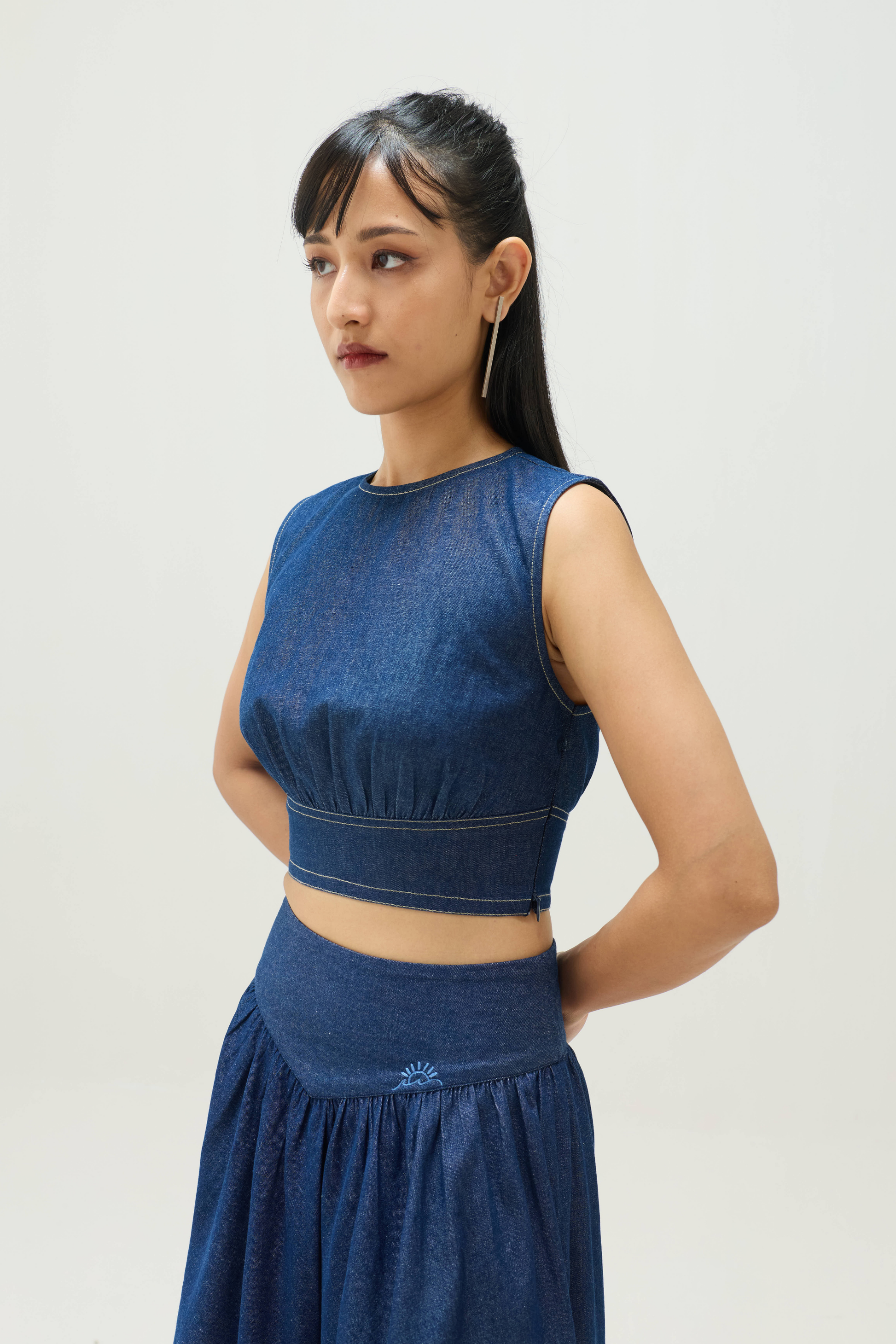 Fitted, sleeveless, round neck crop top crafted in sustainable organic cotton denim fabric.